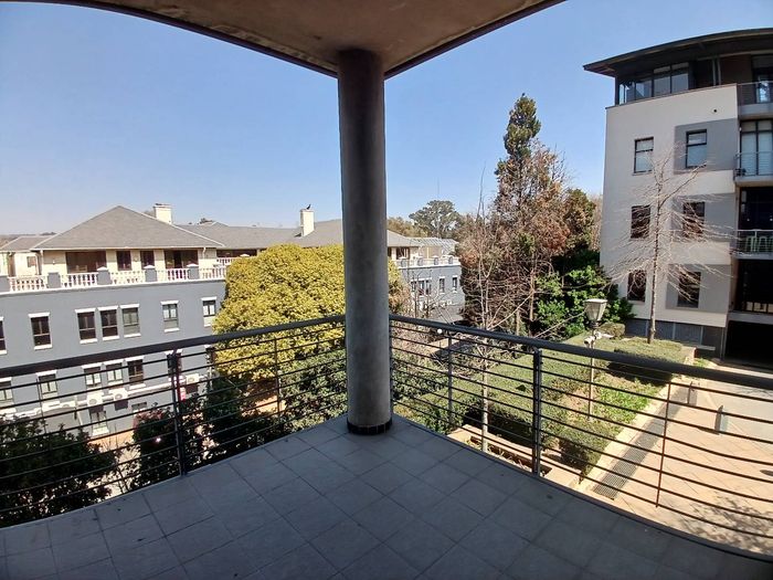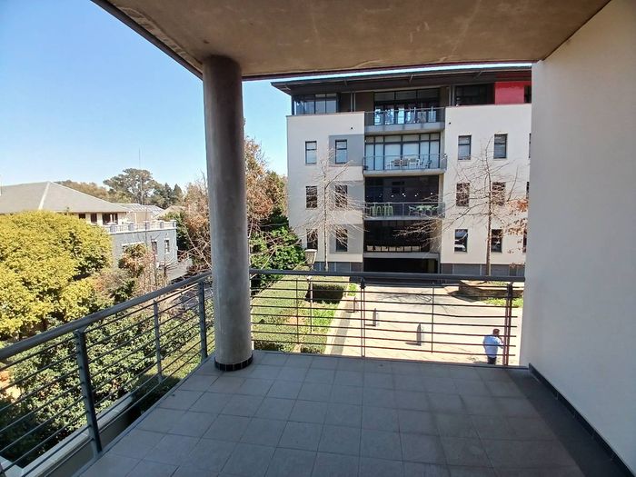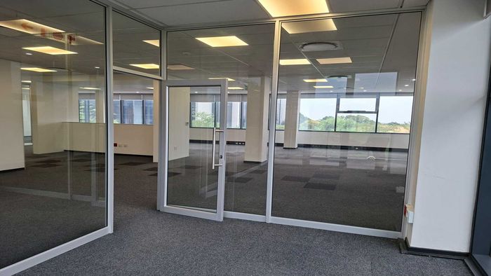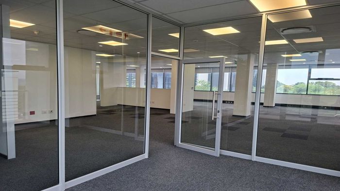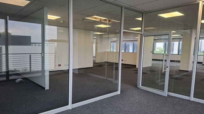 Enjoy productive, commuter-friendly offices in landscaped Knightsbridge Office Park, Bryanston — 350m² first-floor space with floor-to-ceiling glass partitions and a private balcony breakout area.