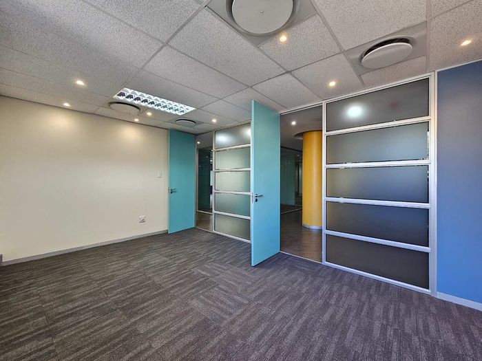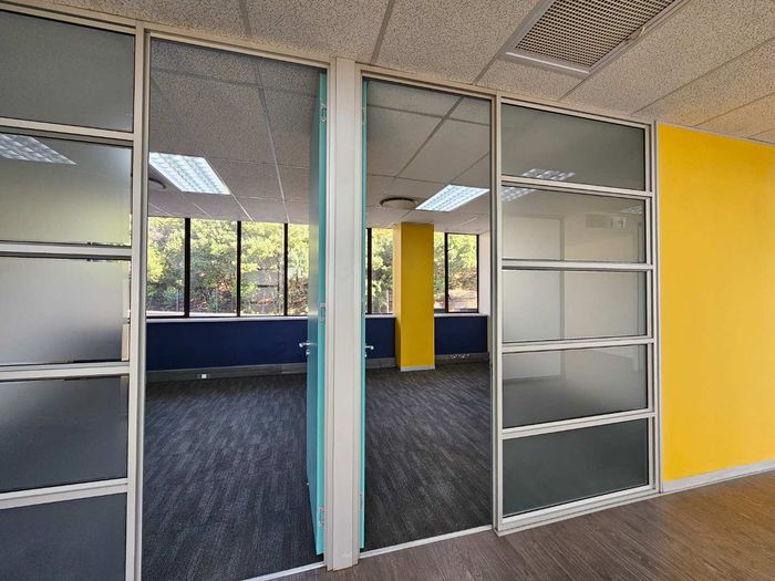 Enjoy work-life harmony in Woodmead, Sandton — ground-floor office within a 43-hectare game park, with partitioned glass offices and an entertainment boma for events.