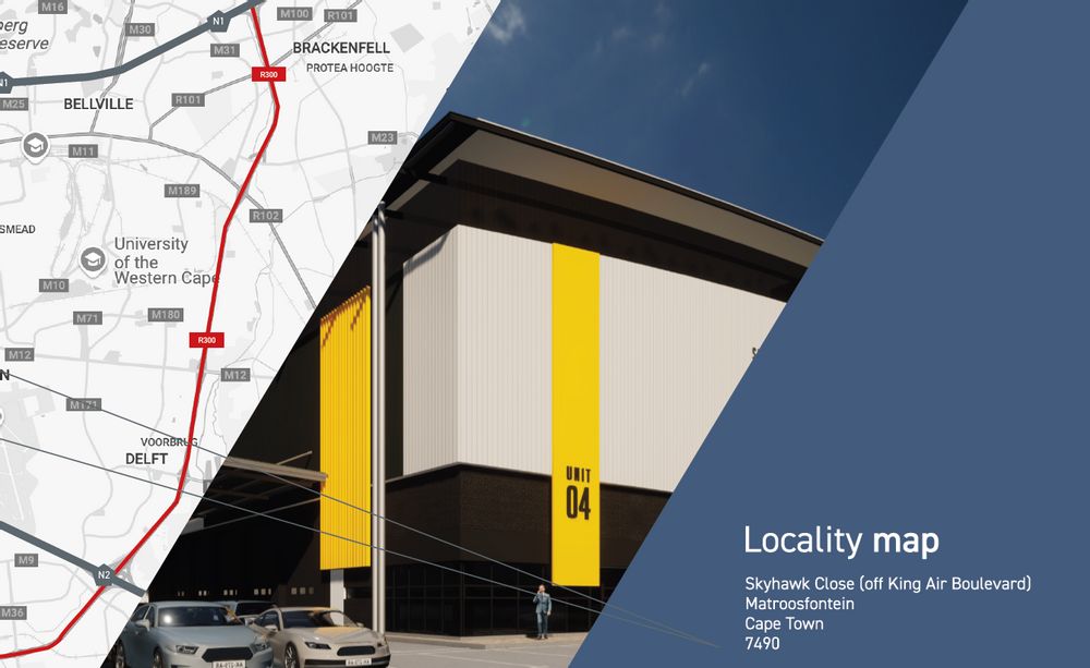 Skyhawk Park is offering four brand-new warehouse units for rent at Airport Industria - Cape Town International Airport, with options for shared or exclusive yards. Premium-grade offices are designed according to the best industrial design practices. This sought-after location in the Airport City Improvement District offers seamless connections and efficient routes to local and international markets, making it ideal for light manufacturing, logistics, freight forwarding, and courier services.