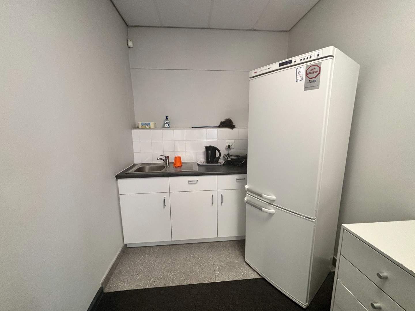 - Small open-plan office area with toilet