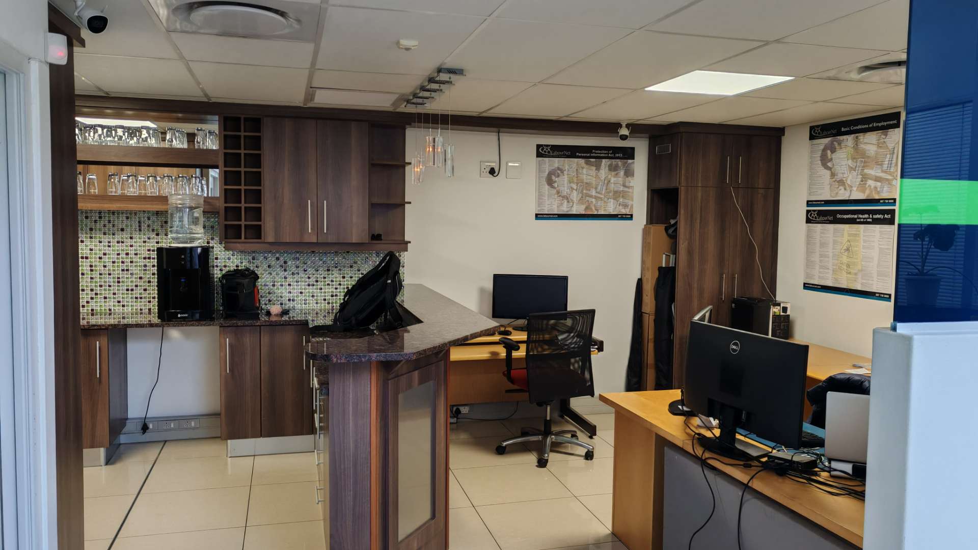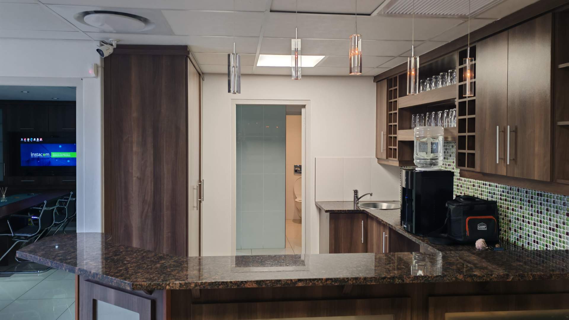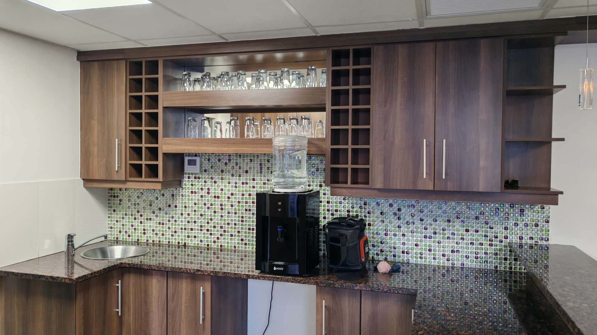 Stylish office kitchen with granite countertops
