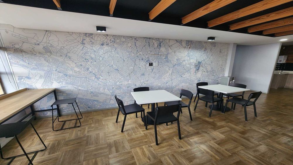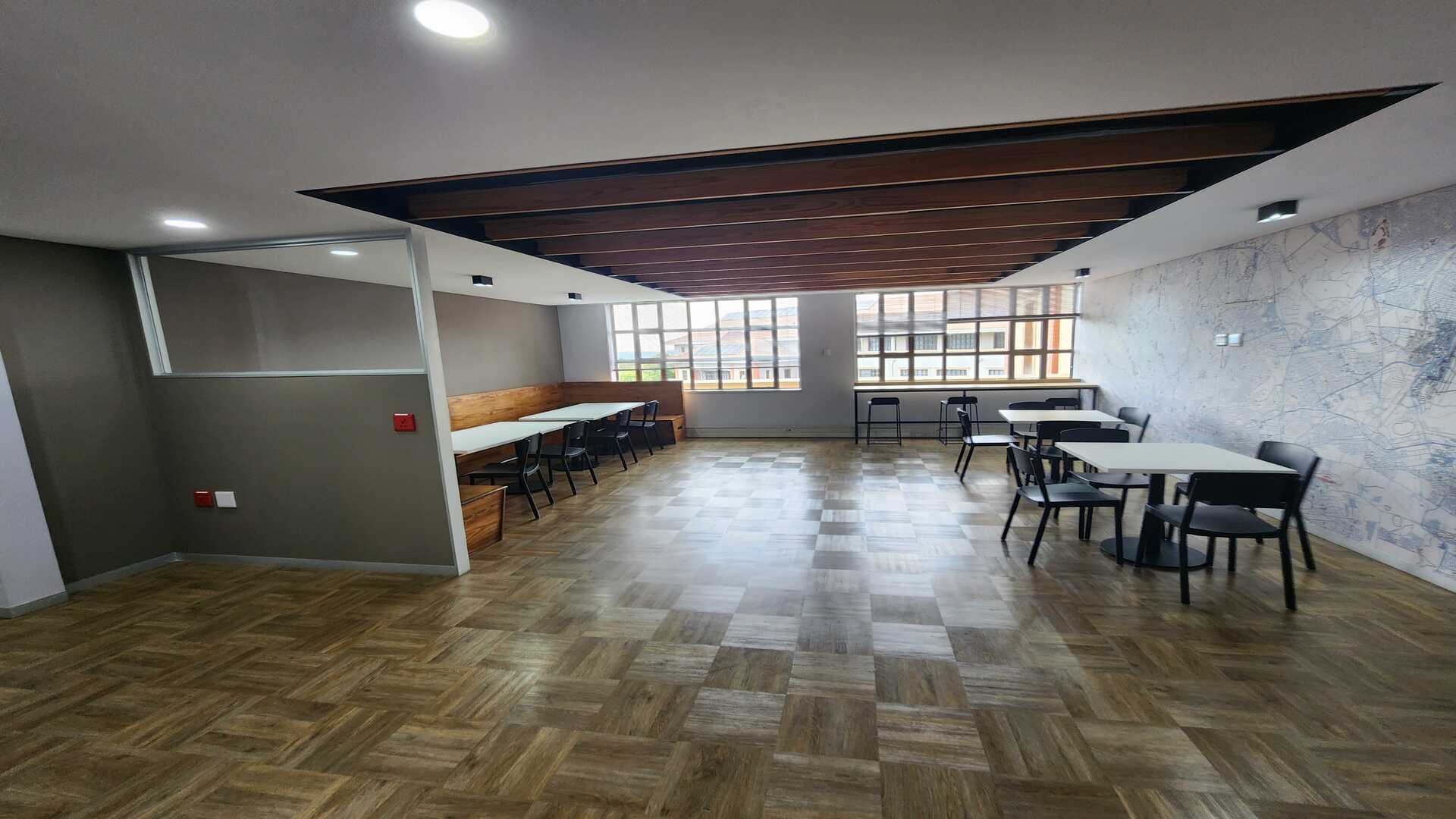 A communal lunch and pause area provides a comfortable space for staff to unwind, collaborate informally, or enjoy breaks within a beautifully designed environment.