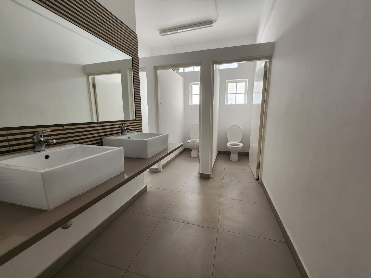 Available on the second floor, the inviting office space features an open-plan layout that overlooks the lively Waterkant Street. The abundance of natural light creates a warm and welcoming working environment, making it an ideal setting for productivity. Access to this floor is easy via either the staircase or lift, and separate male and female restrooms are available, along with a practical wash-up sink for added convenience.
