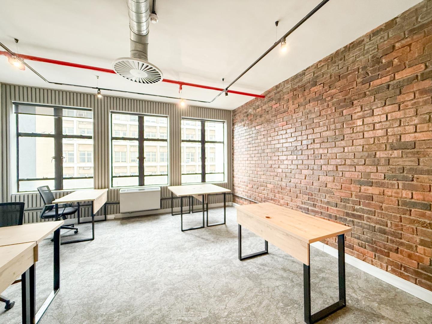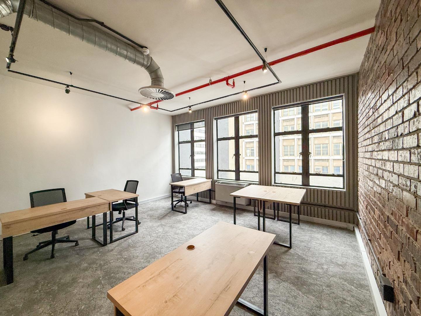 - Custom desks with ergonomic chairs provided
