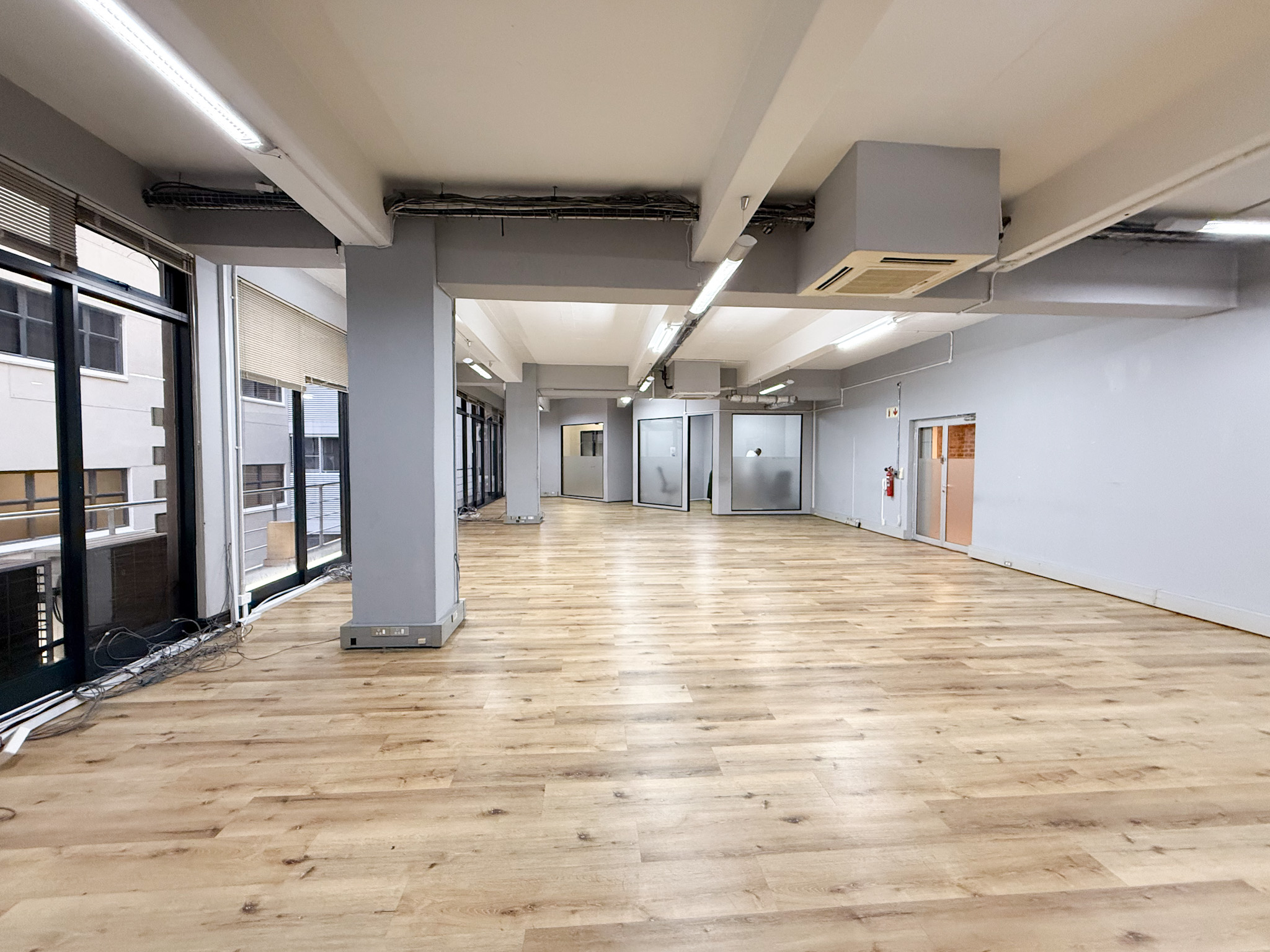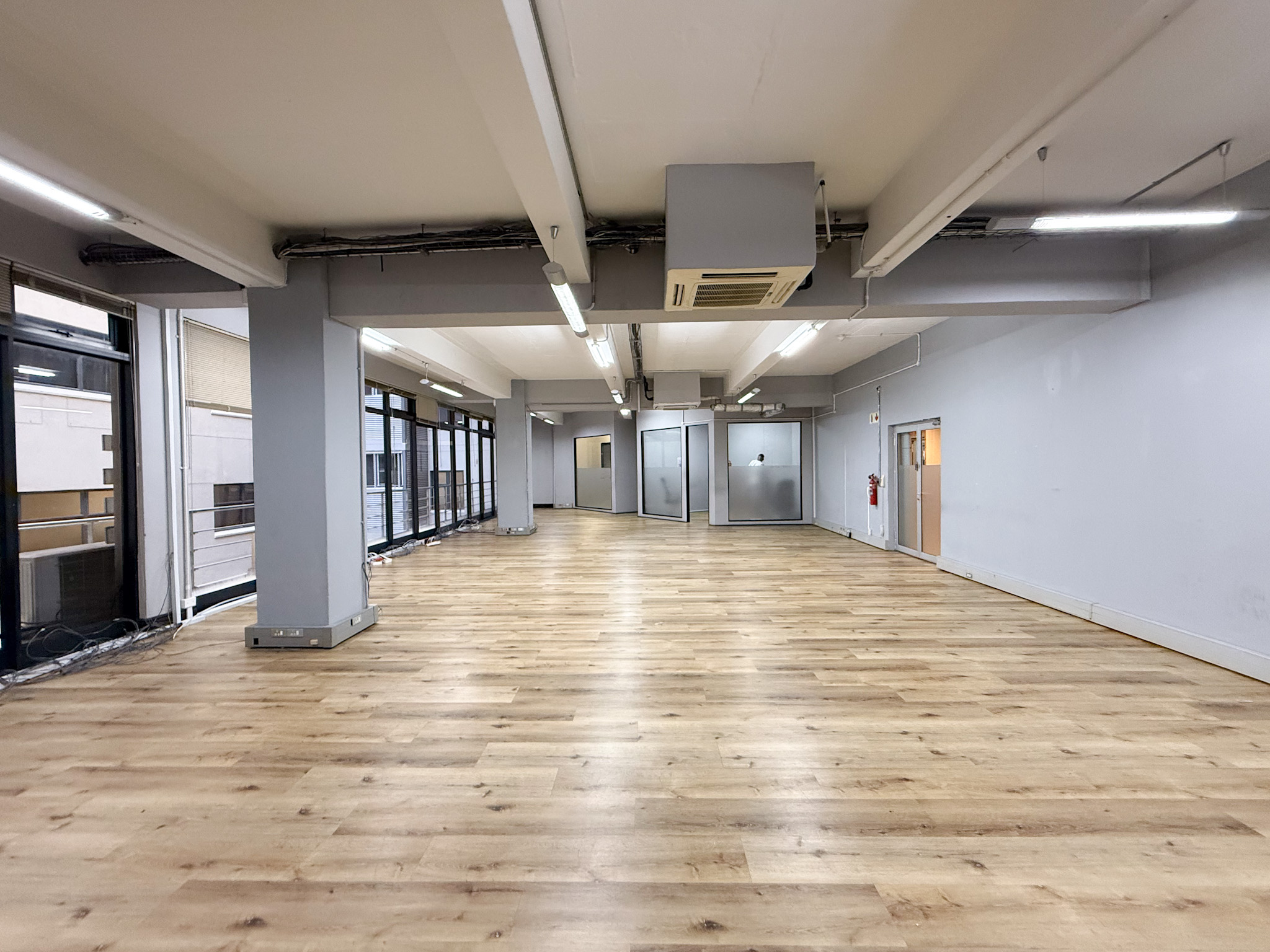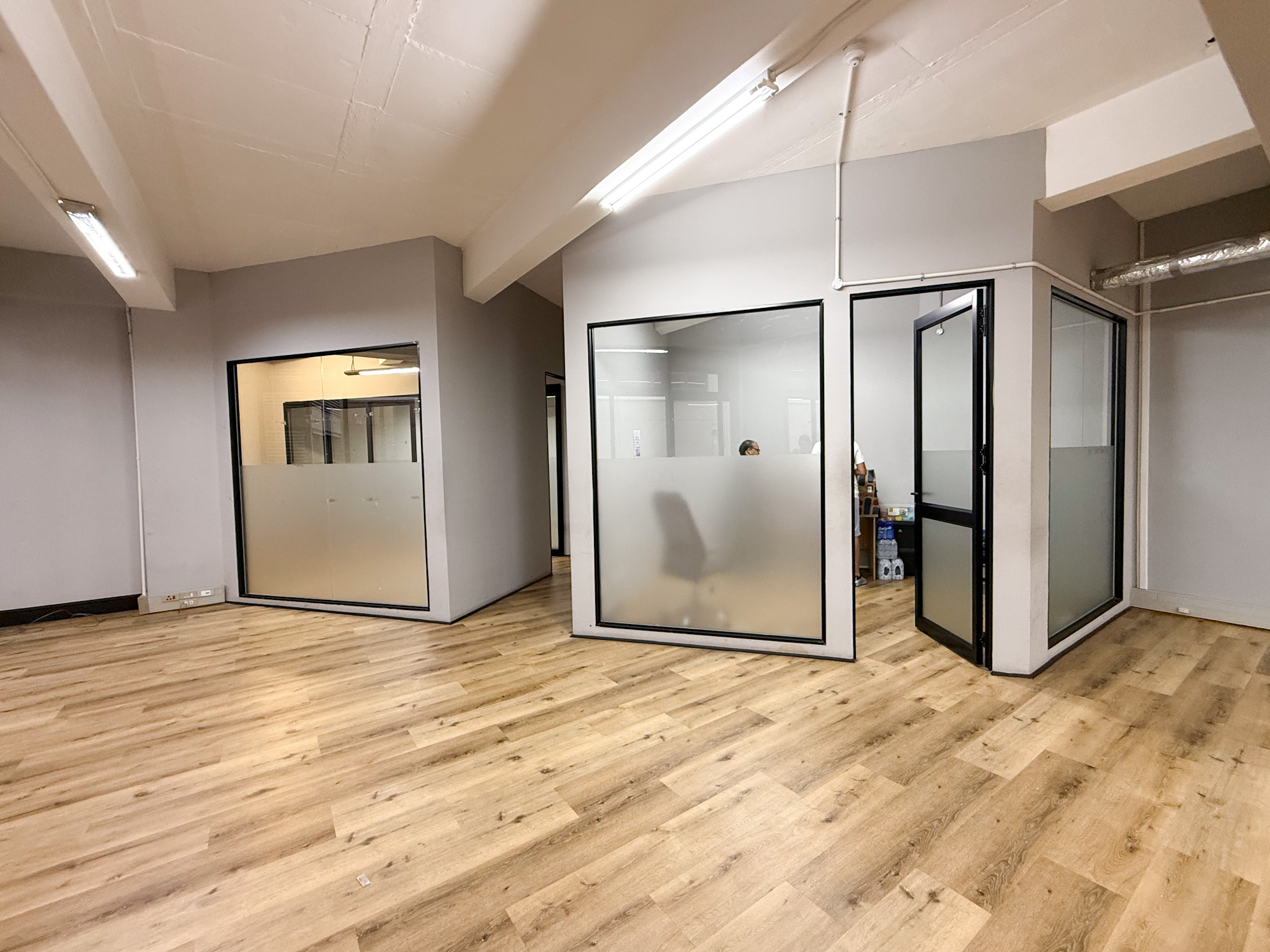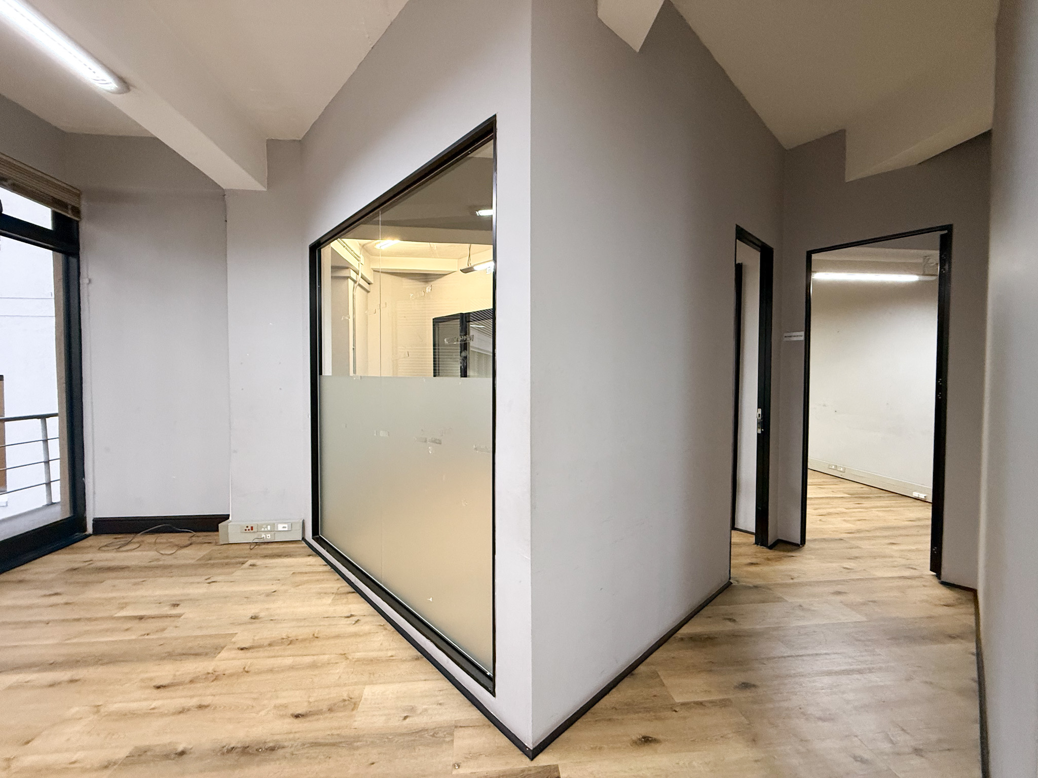 Situated on the 6th floor, the office features a predominantly open-plan layout with one private office. The right-hand side of the space includes a boardroom and an additional meeting room, while the left-hand side accommodates a storage room, kitchenette, and separate male and female restrooms. A large private balcony provides an inviting breakout area with fresh air.