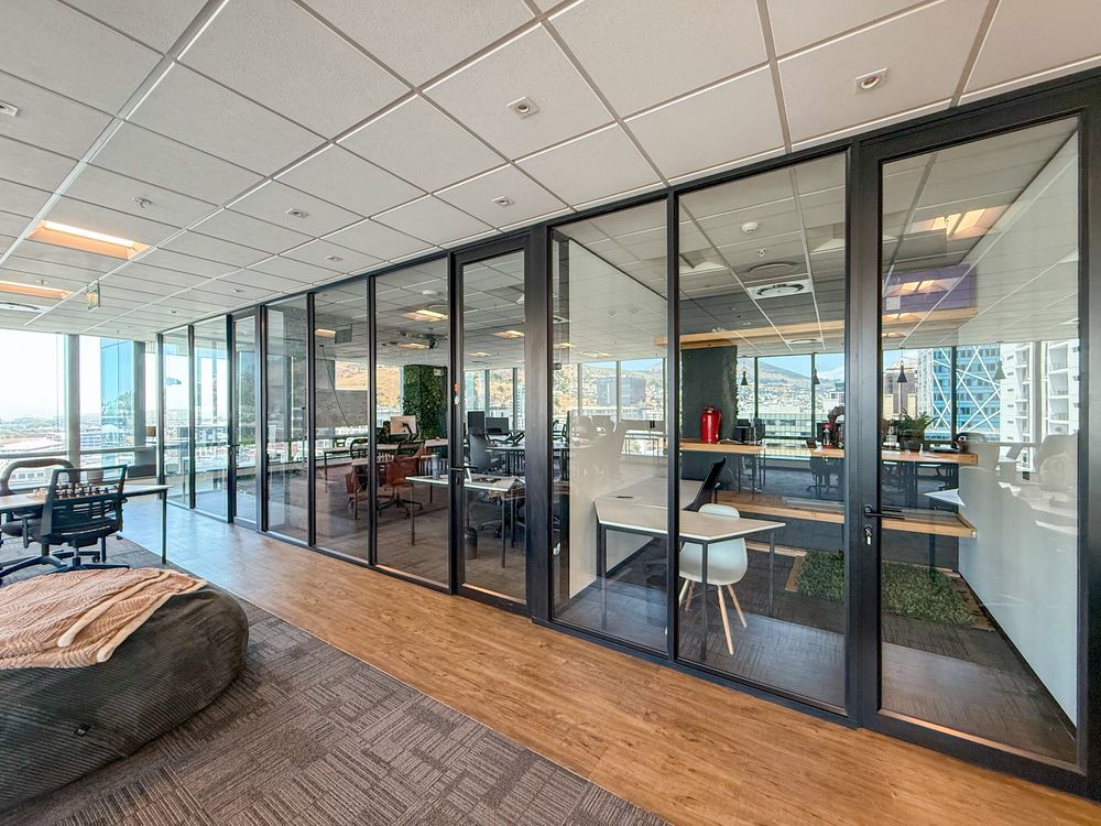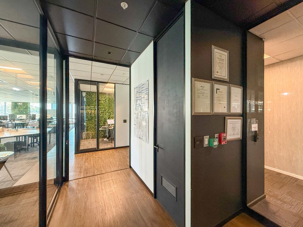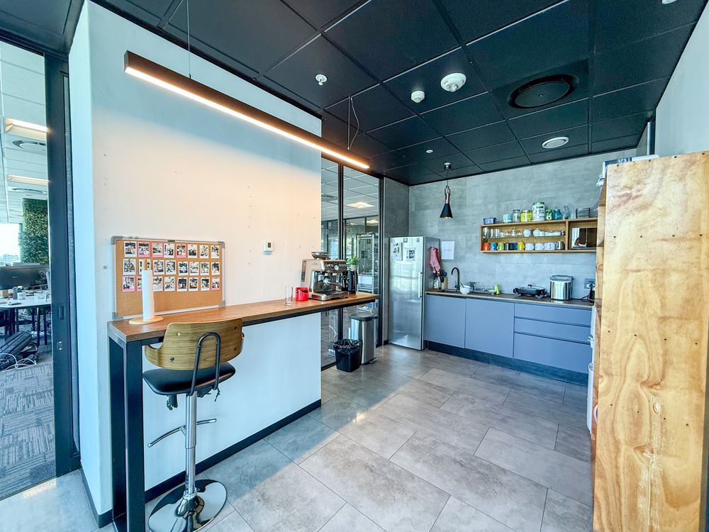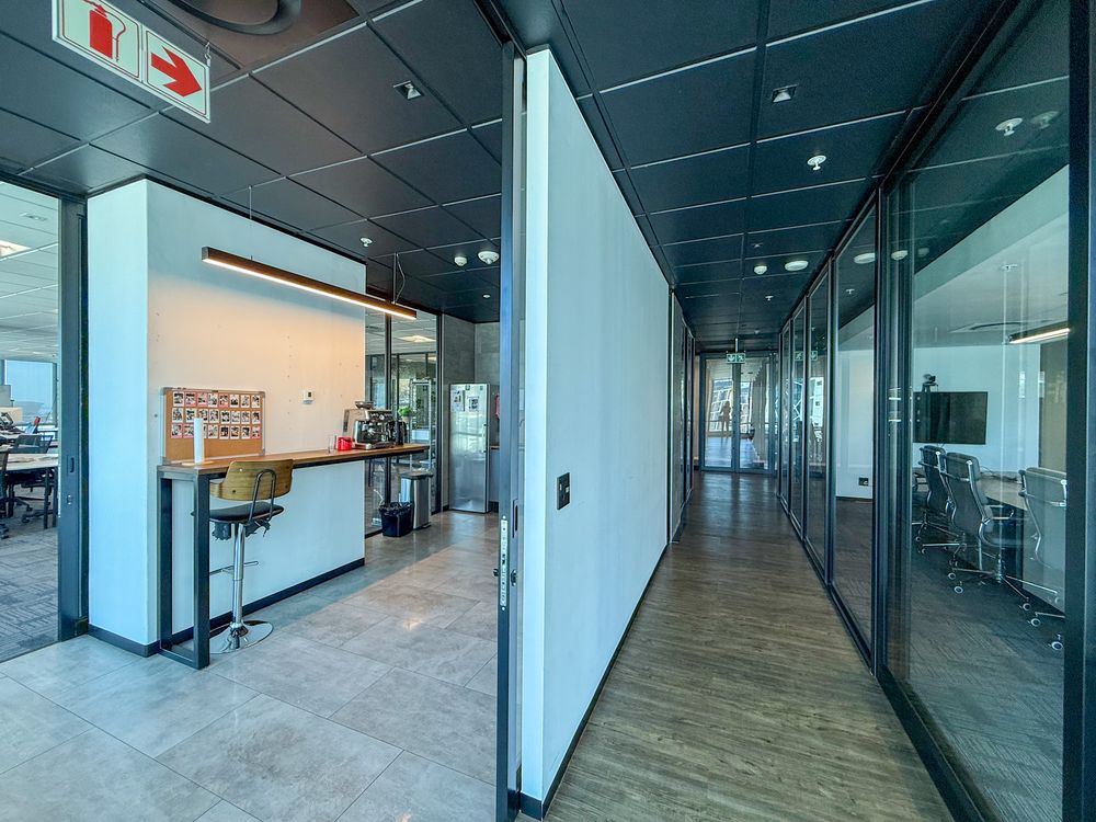 The office features a large open-plan layout complemented by multiple glass-partitioned private offices, creating a light-filled and contemporary workspace. A beautiful boardroom with next-level views provides an impressive setting for meetings and client engagements. The space also includes a fully fitted kitchenette and canteen area, ideal for staff convenience and informal collaboration.