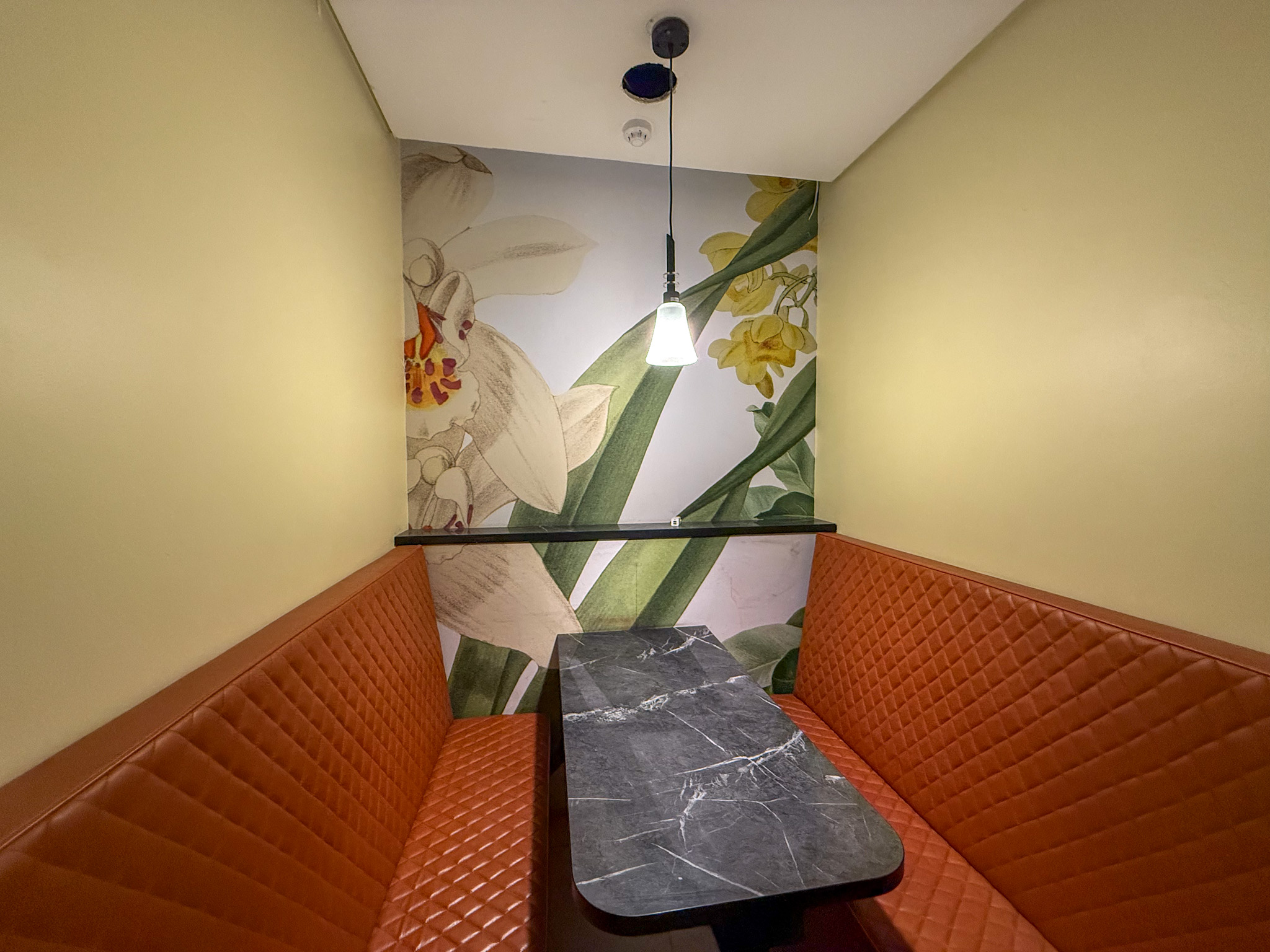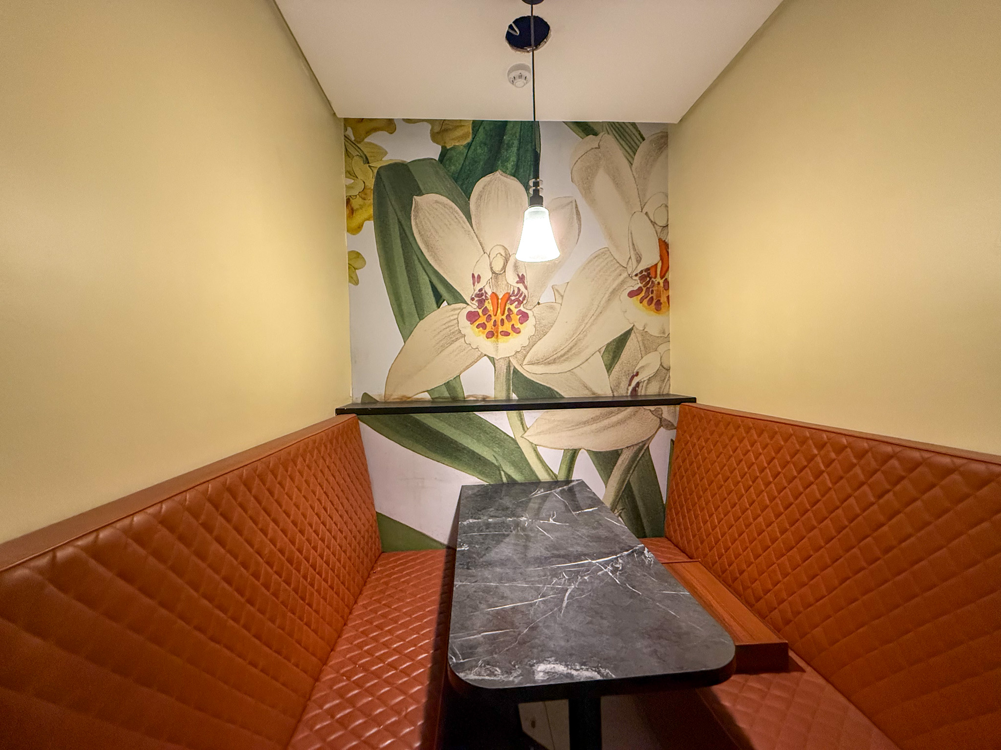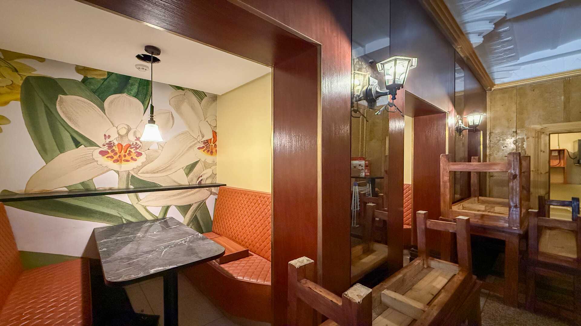 The unit features a reception area, three booth-style seating sections, and a back room that can easily be converted into a compact kitchen, making it ideal for a takeaway, café, or boutique dining concept.