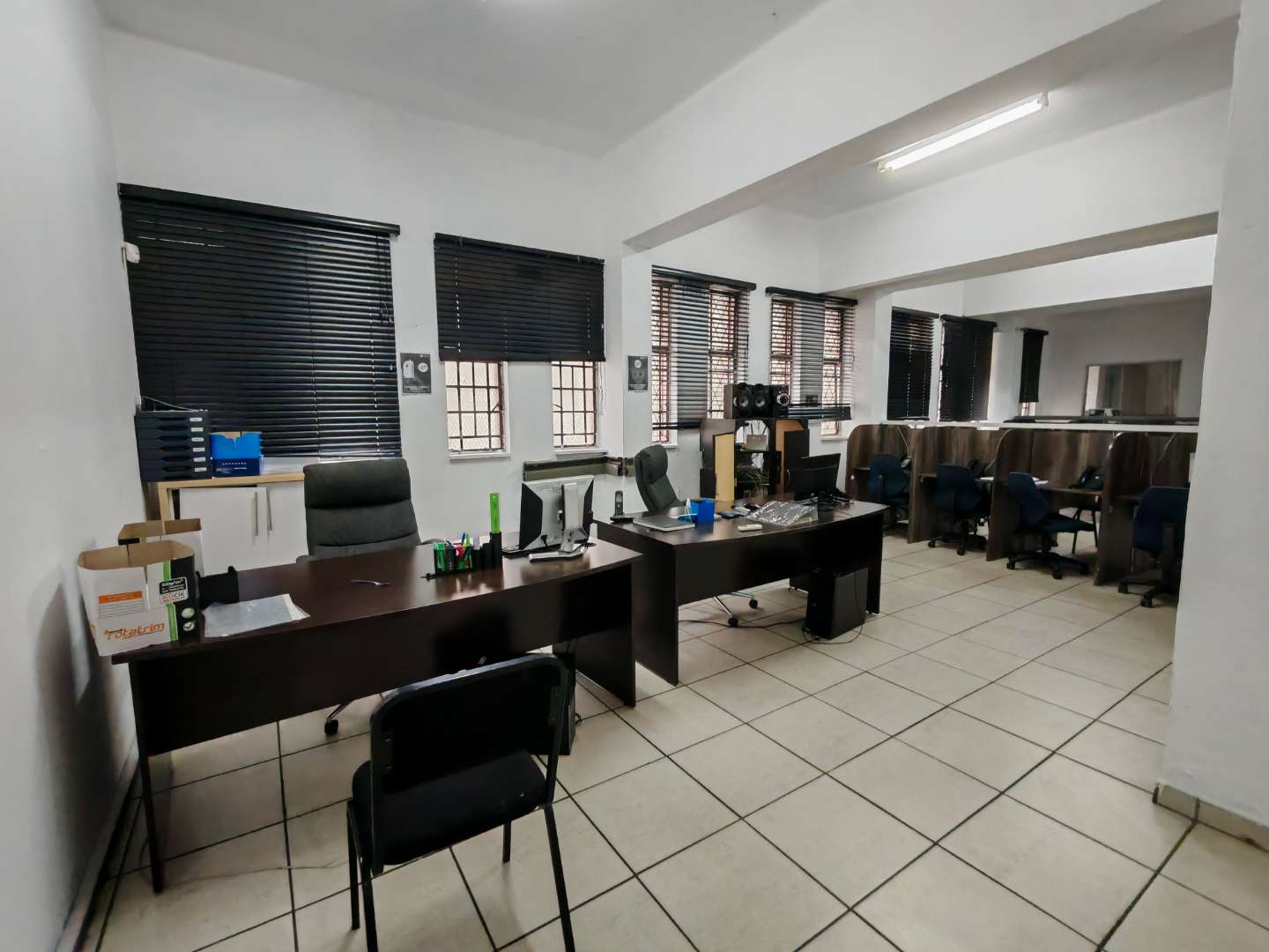 Ascending to the first floor, you will find a well-equipped call centre and two additional offices, perfectly suited for administrative operations or client interactions. The bathrooms on this floor are in good condition, ensuring comfort and convenience for your staff. The spacious kitchen is also in excellent condition, offering a practical and efficient space for meal preparations and breaks.
