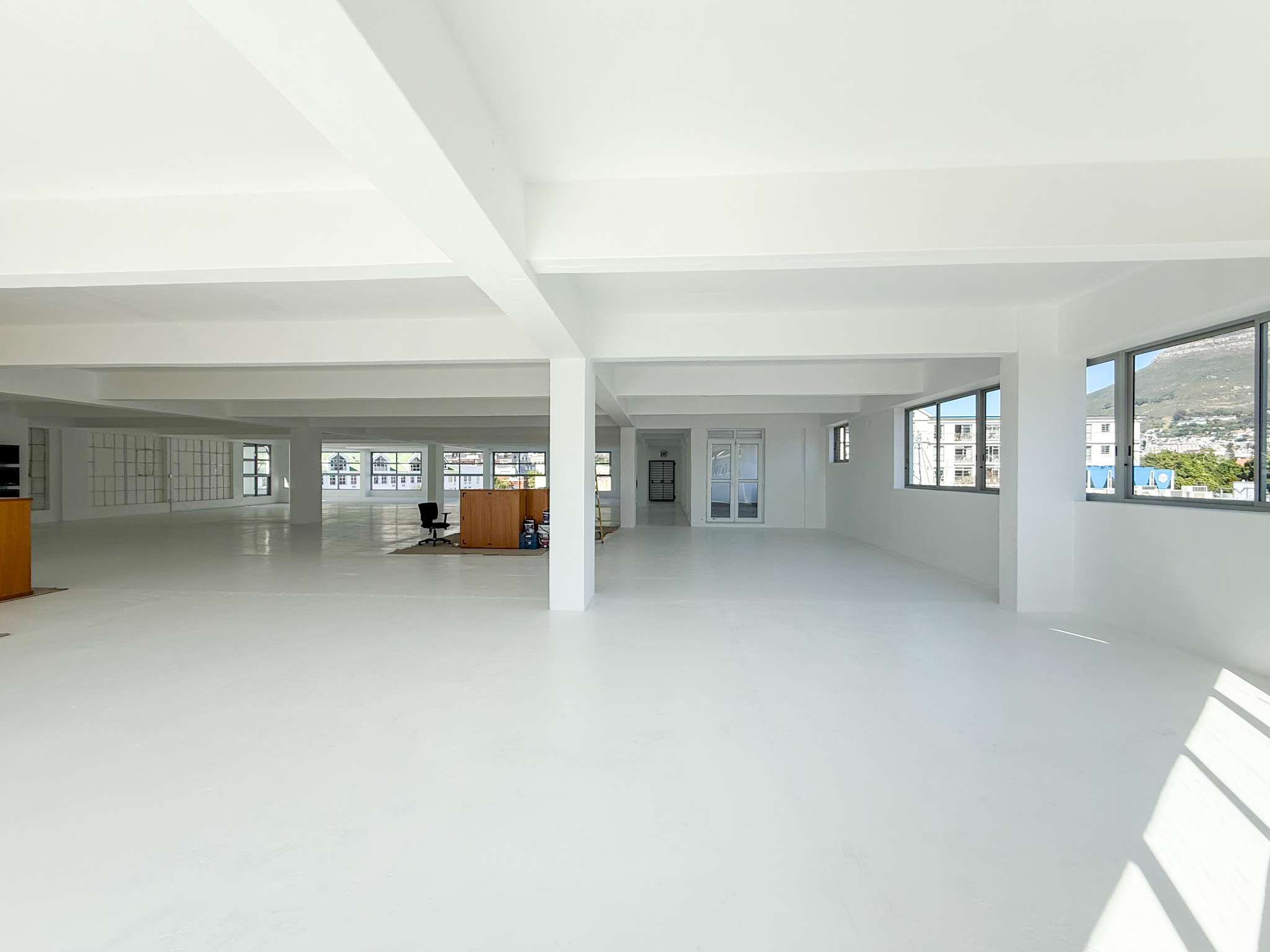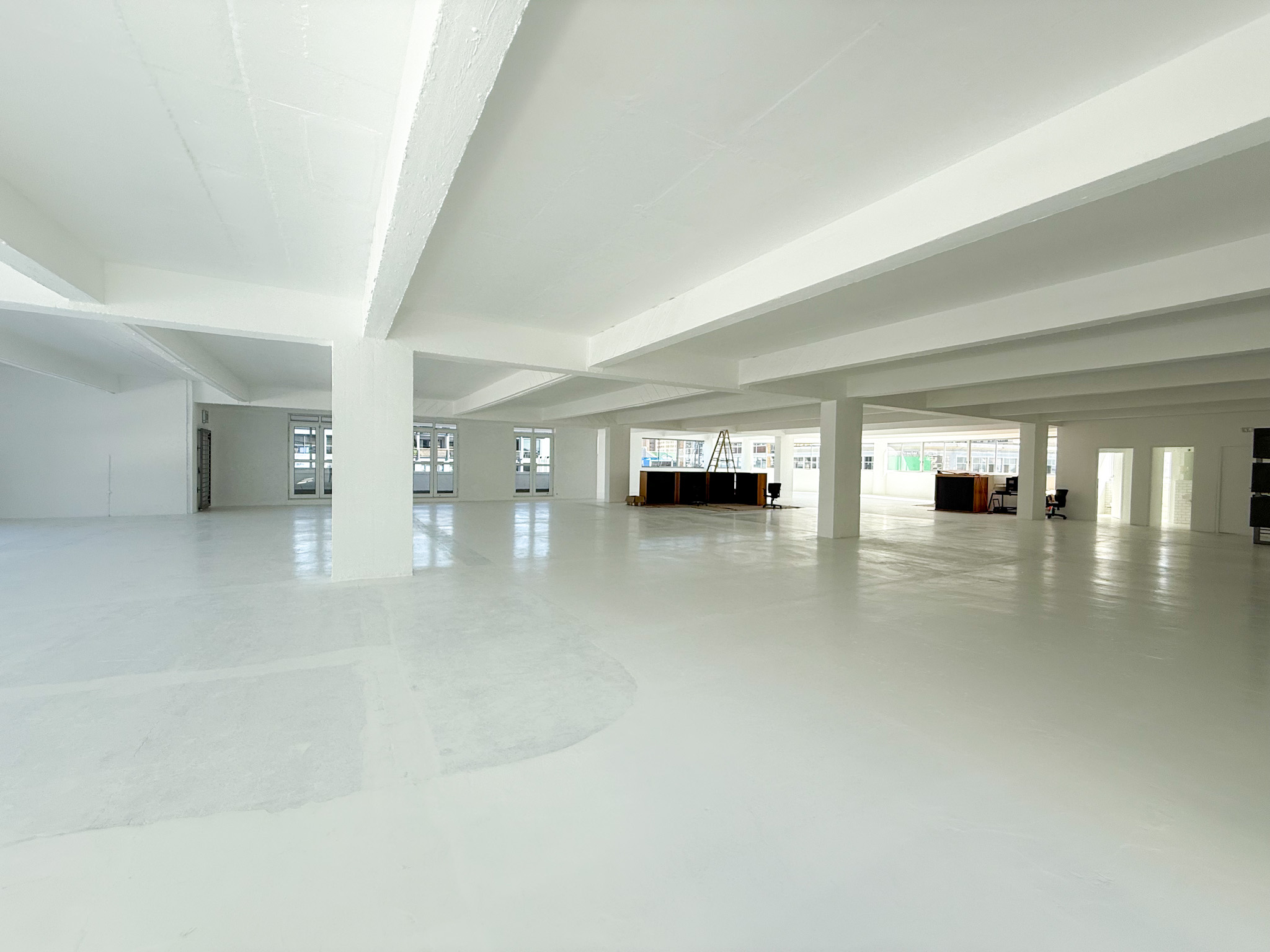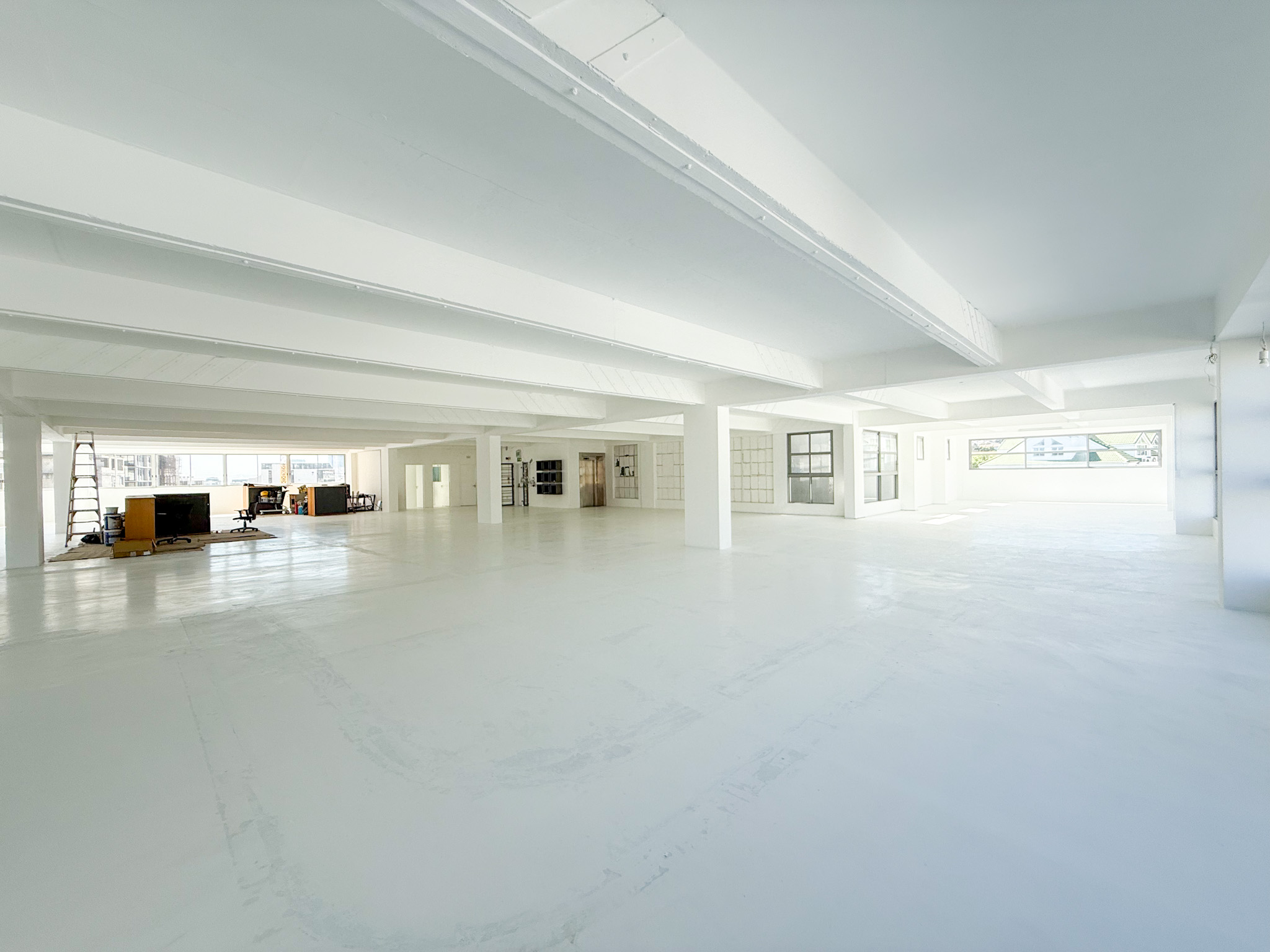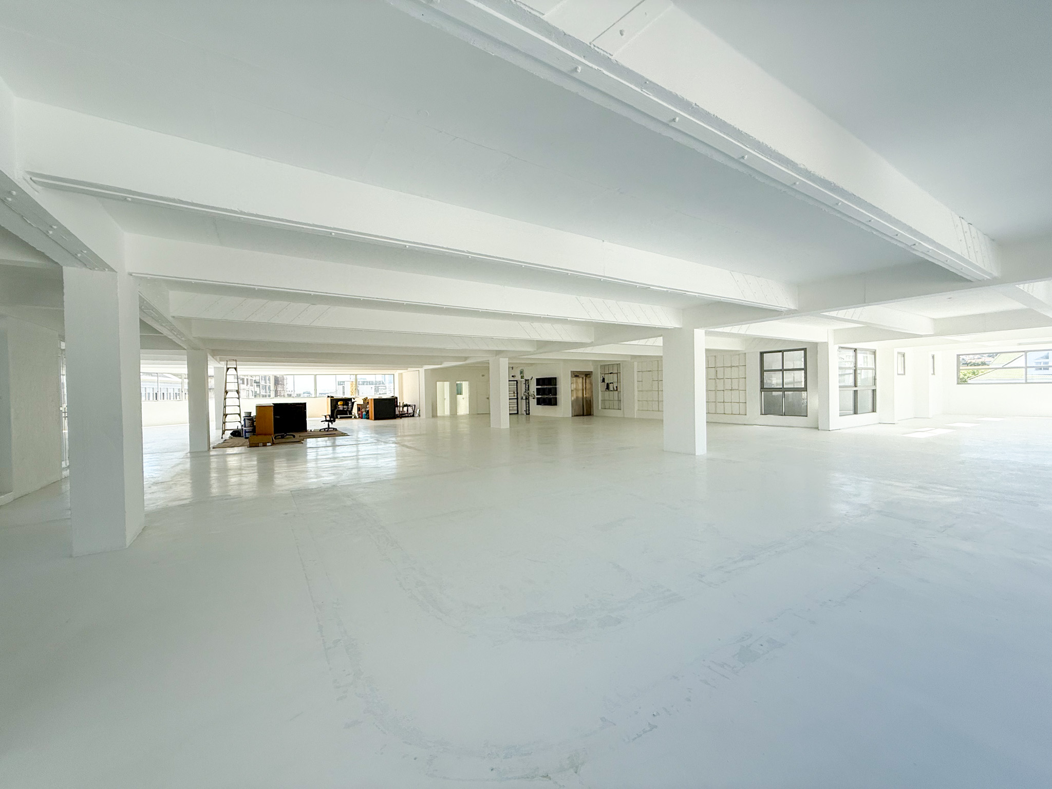 - White-boxed interior with a large, open-plan layout ideal for collaborative office setups