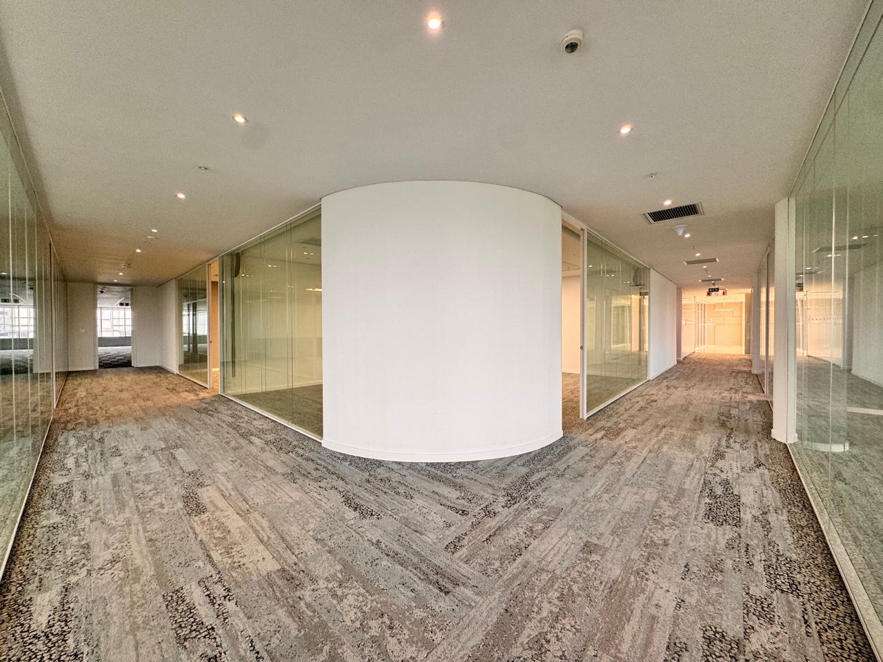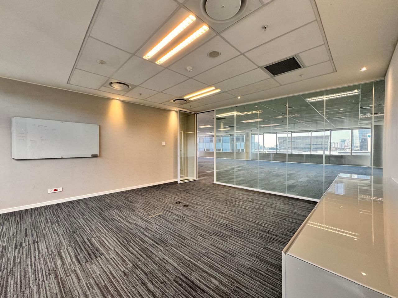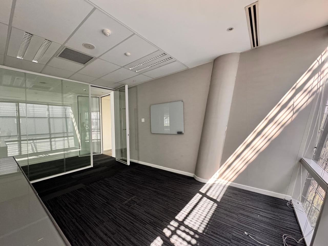 An impressive 2,985sqm office space at The Annex, 15 Alice Lane, Sandton showcases an upmarket fit-out designed to meet the needs of a modern corporate tenant. The interior features a beautiful reception area with a built-in desk and waiting area, elegant glass boardrooms, enclosed offices, two kitchenettes, a full kitchen with eating area, meeting rooms, and an expansive open-plan workspace. A tenant installation allowance is available from the landlord, offering flexibility for customization.
