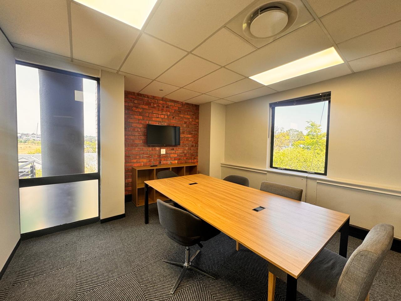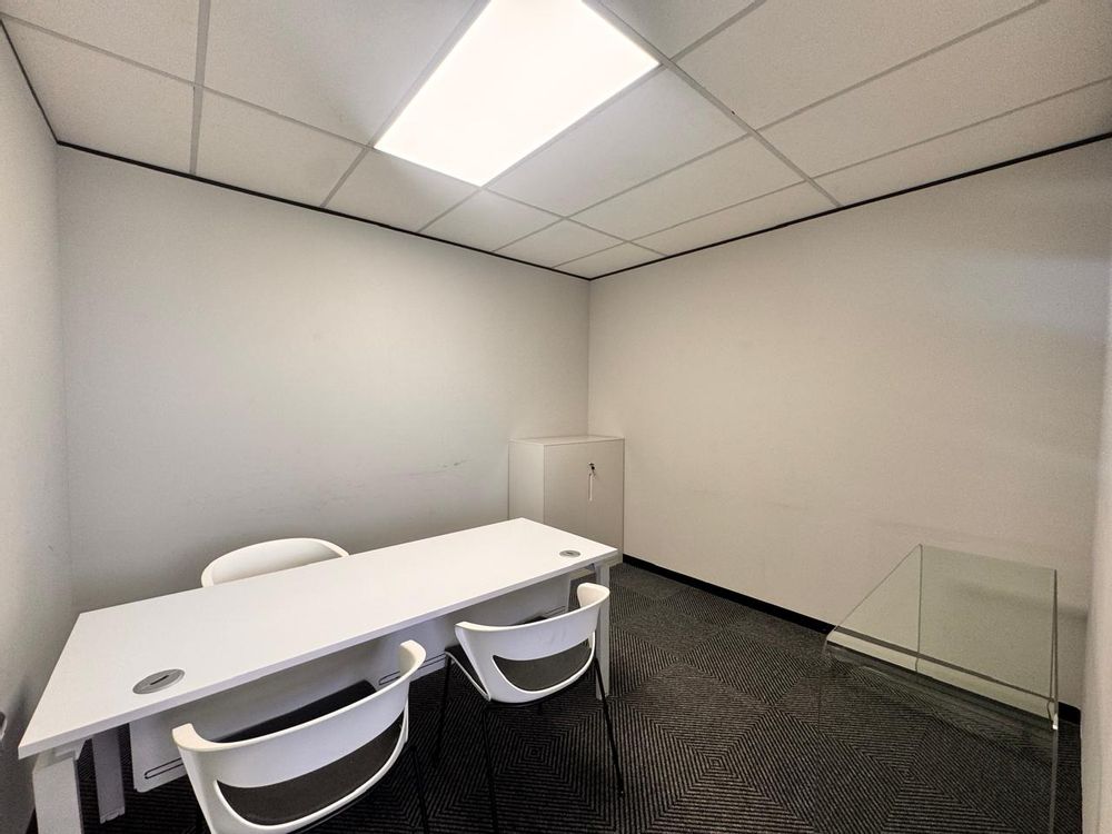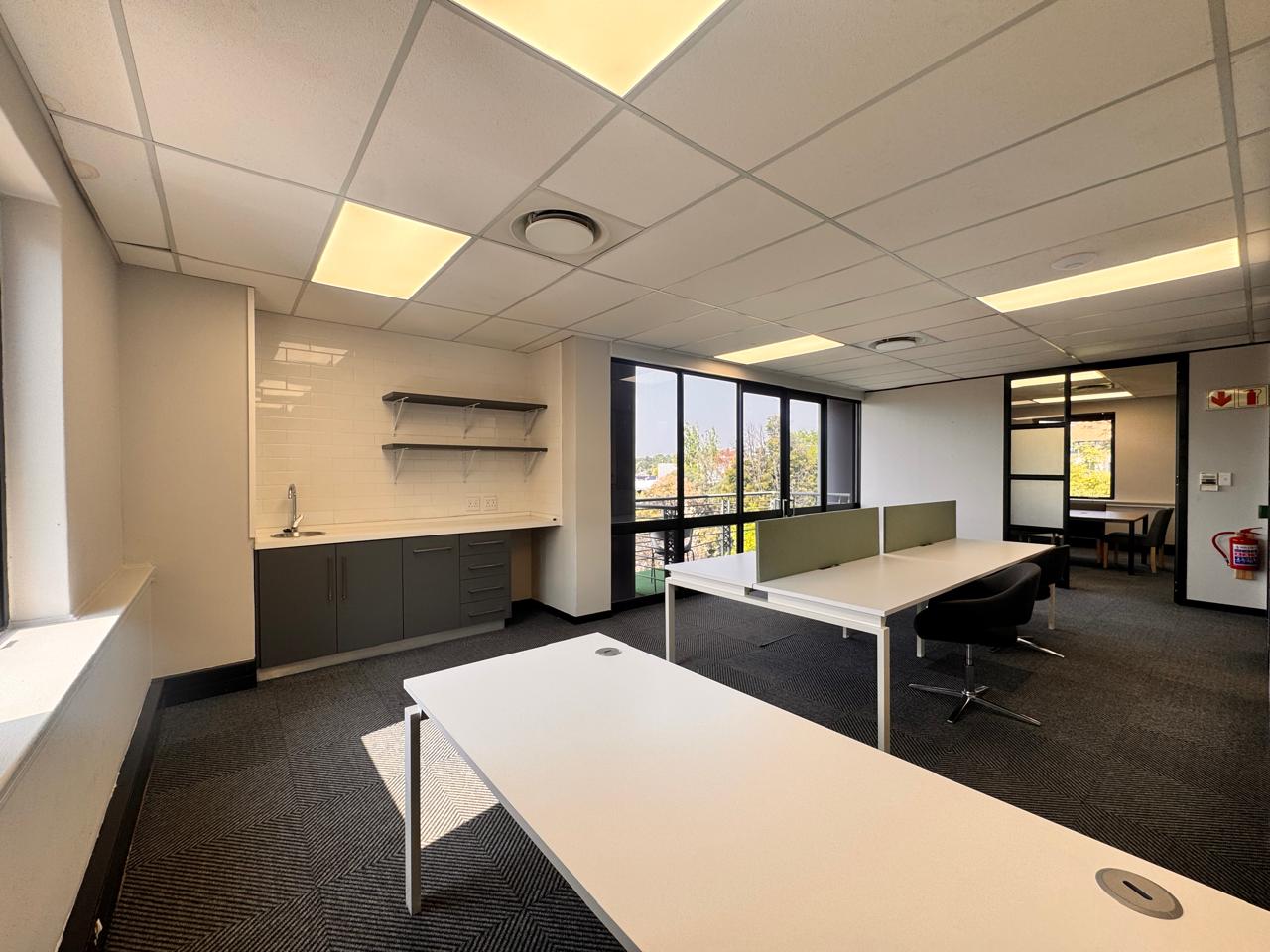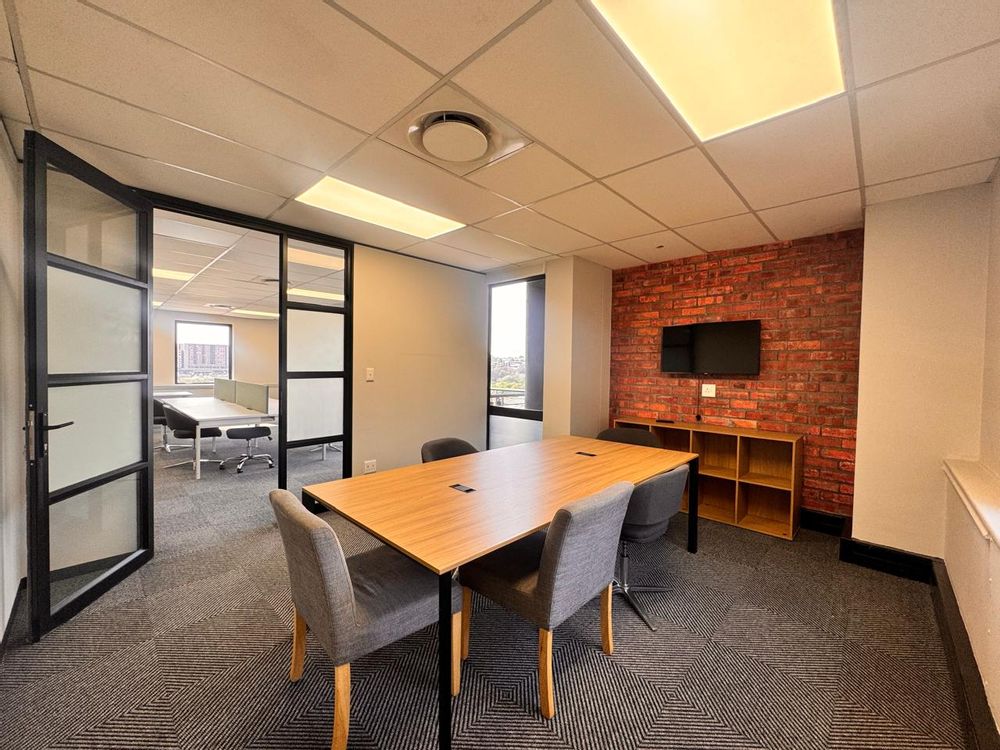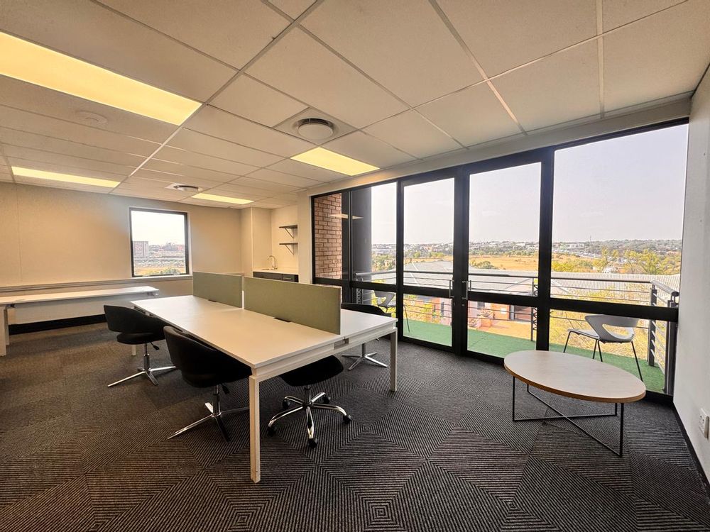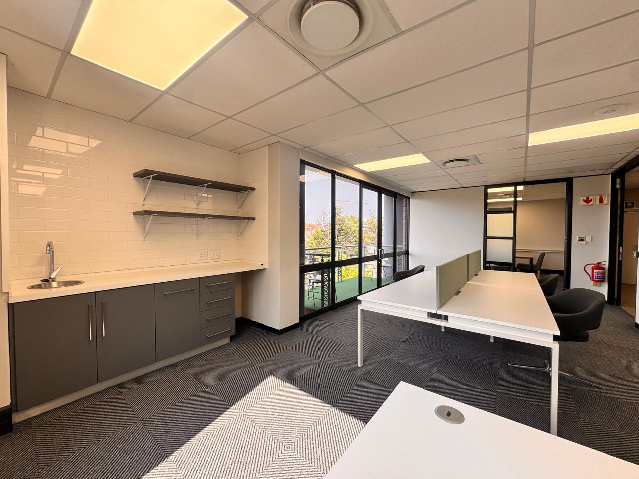 Offering 96sqm of serviced office space, this office at Vunani Office Park, 151 Katherine Street, Sandton combines functionality with style. The layout features an open-plan area, boardroom, enclosed office, kitchenette, and a private balcony, making it ideal for small teams or executives seeking a professional workspace. A tenant installation allowance is available to assist with any customization.