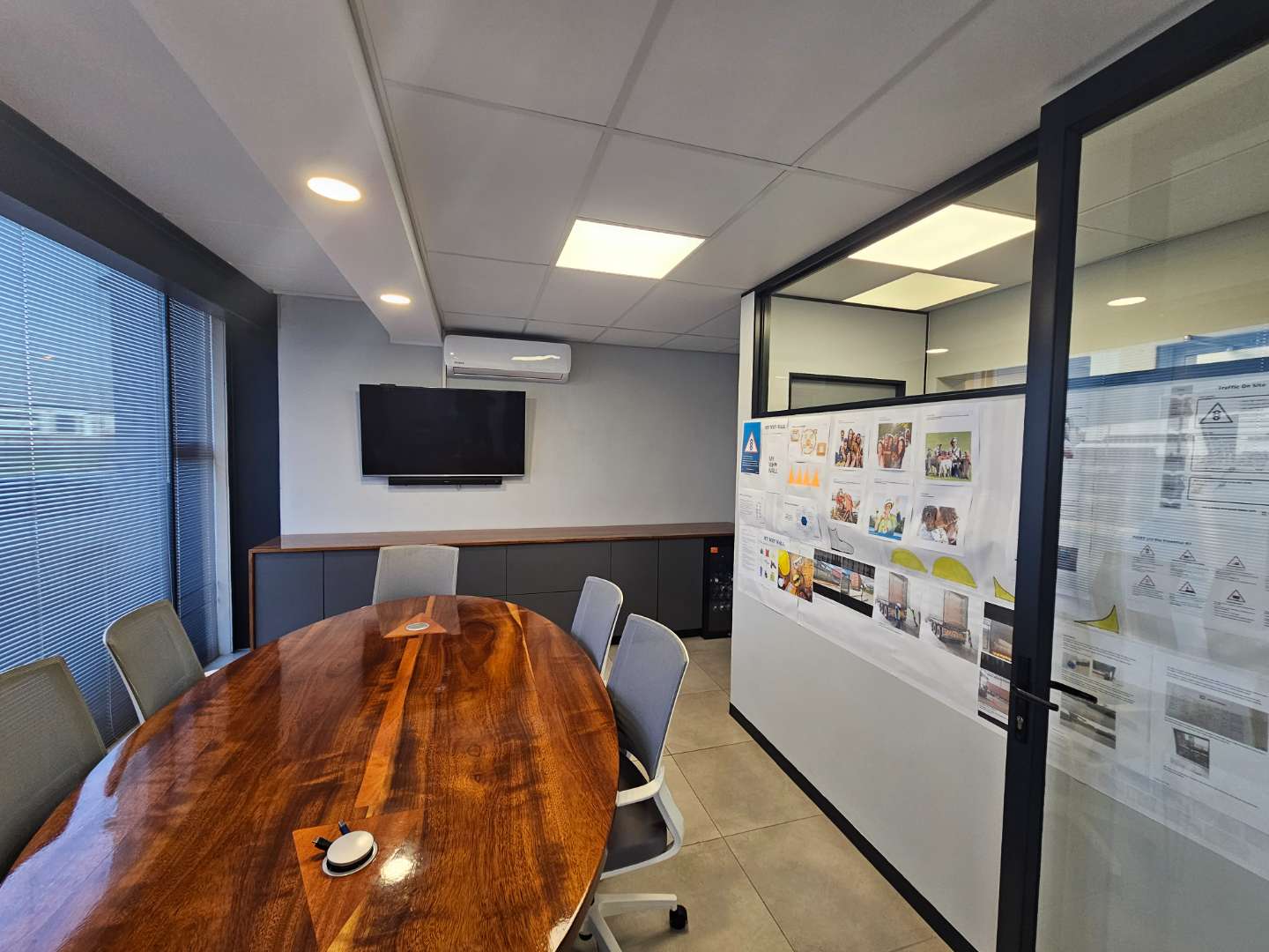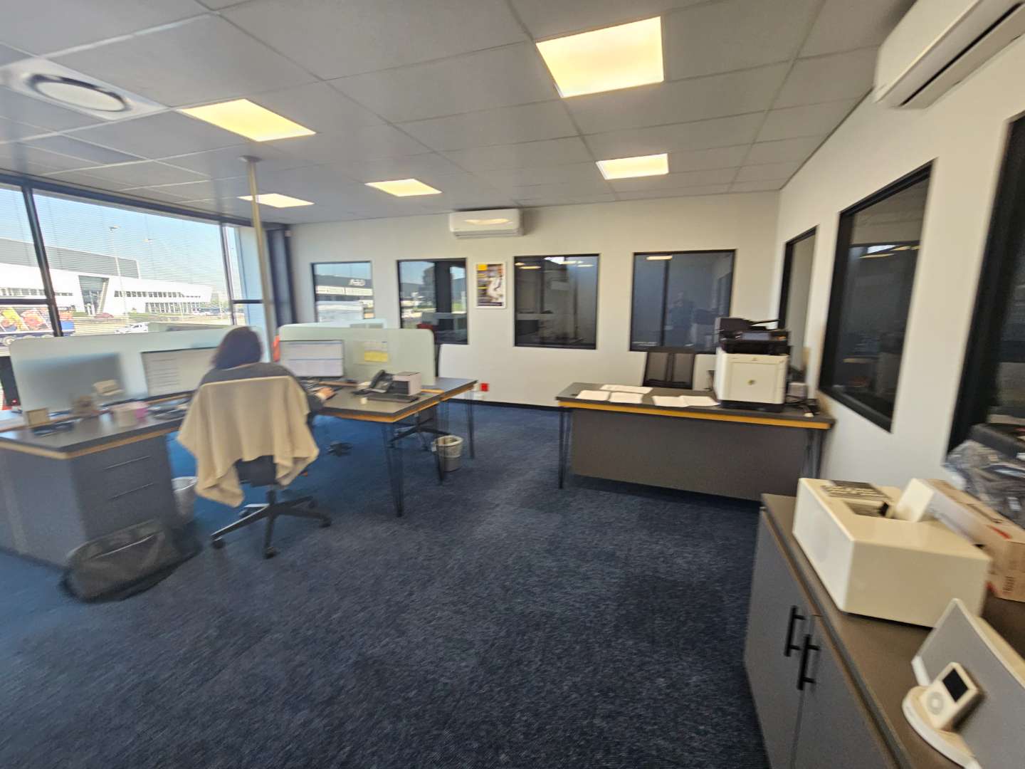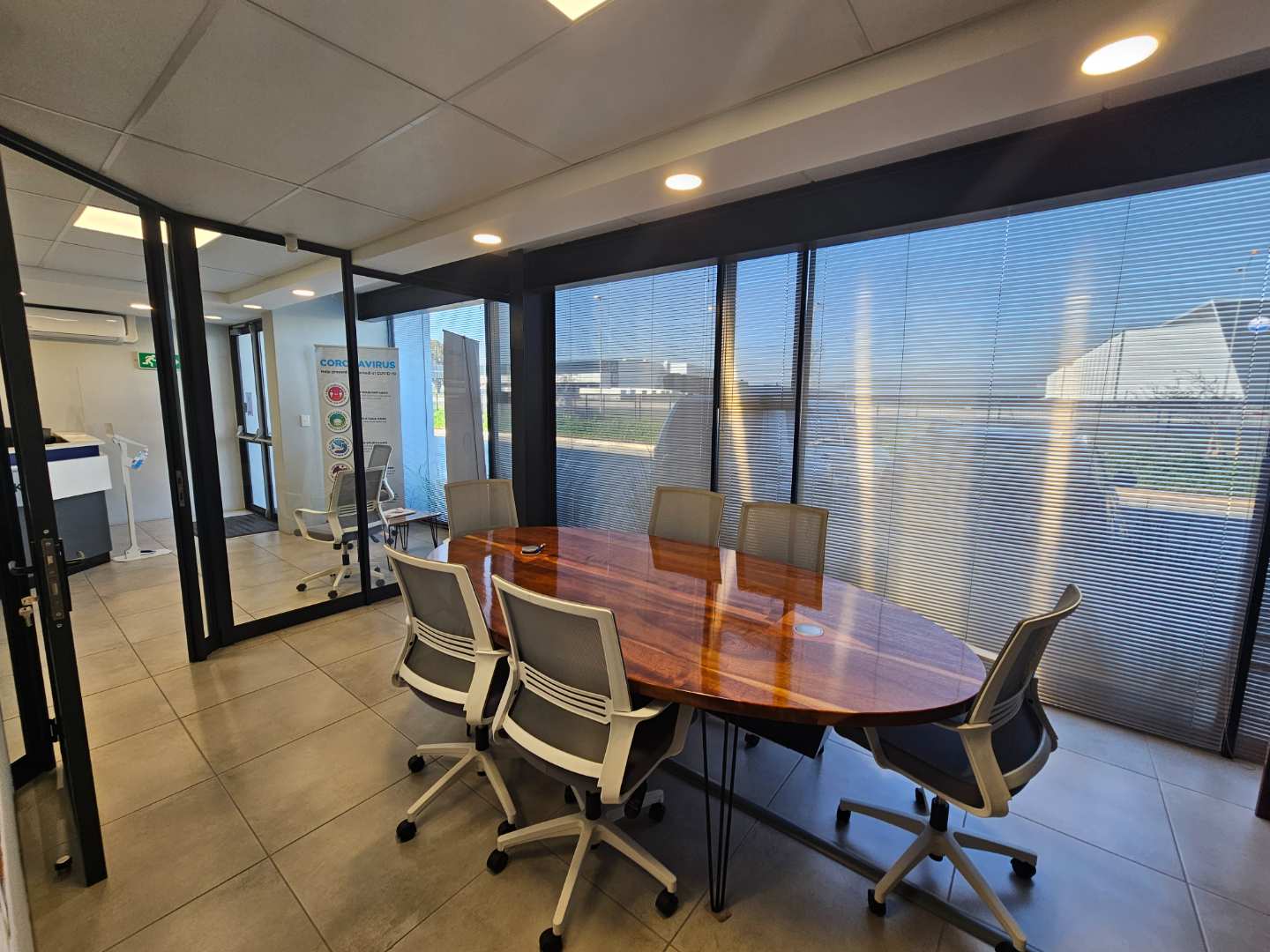 The unit comprises a neat reception area, a dedicated boardroom, and a combination of closed and open-plan office space, allowing flexibility for different operational requirements. Ablution facilities and a kitchenette complete the office component.