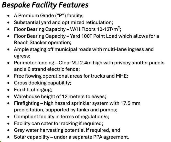 Key specifications include an 8-meter eaves height, sprinklers, and foil insulation to maintain optimal conditions. The warehouses are fitted with 15 x 6m roller shutters for efficient receiving and dispatch processes, and a dedicated wash bay for vehicles enhances operational convenience.