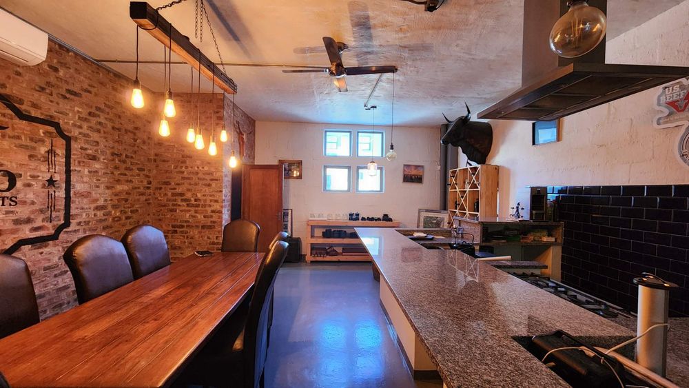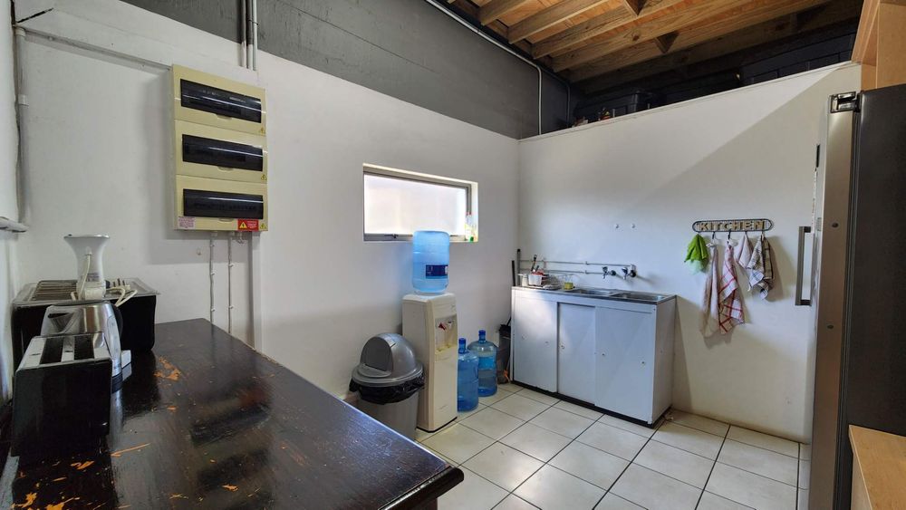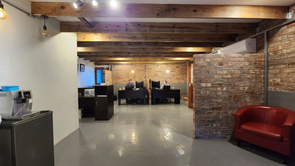 Upstairs is state of the art offices with backup power, backup water, airconditioning and upmarket furnishings. The current layout has two open plan office areas, a smaller closed office, ablutions and a store room.