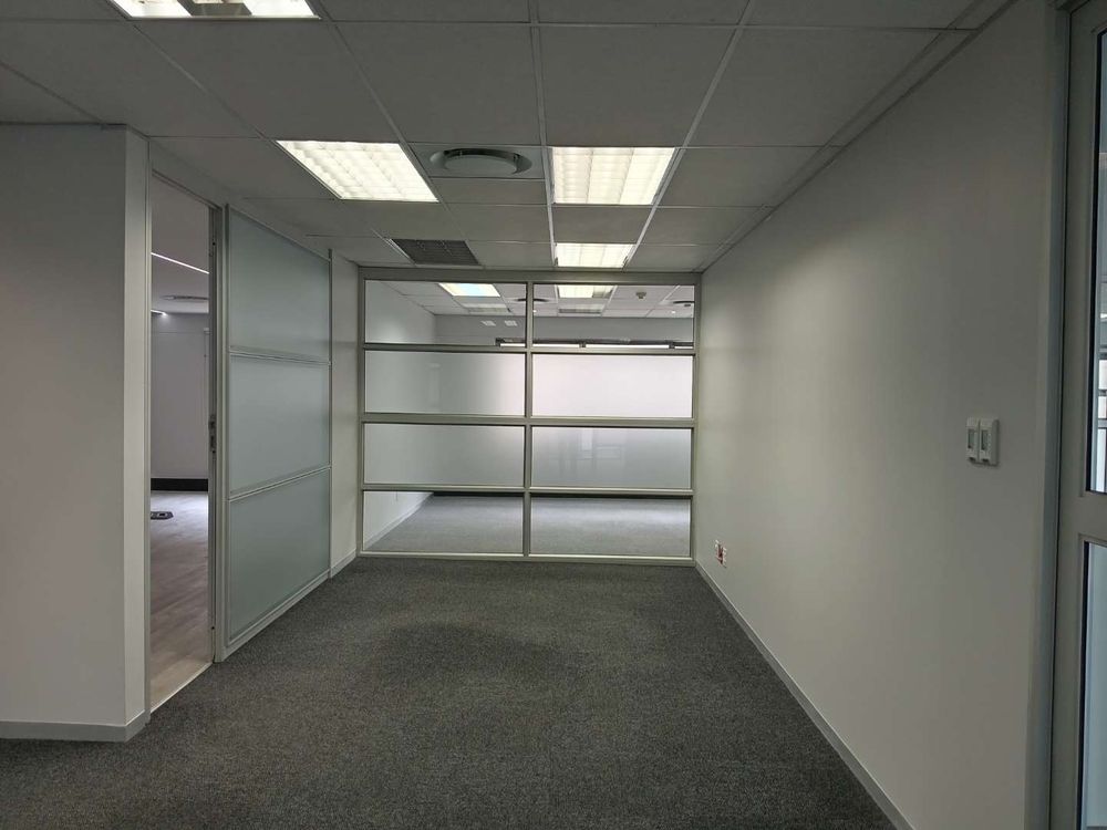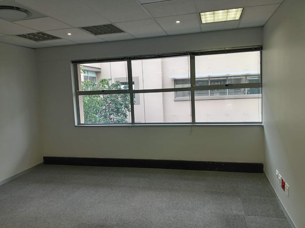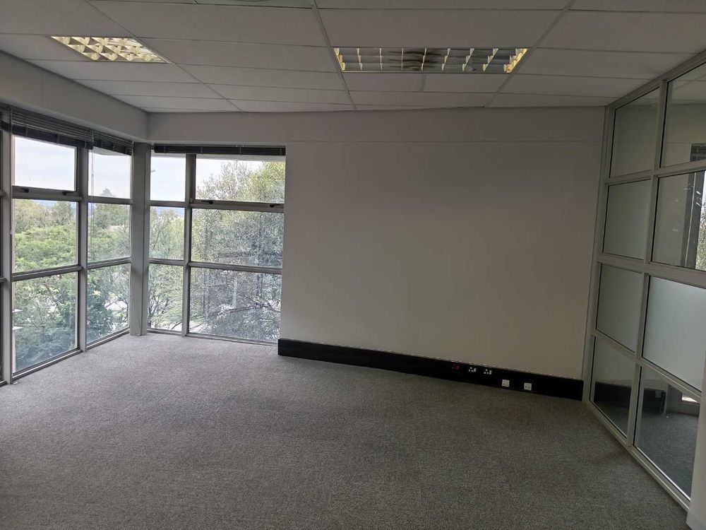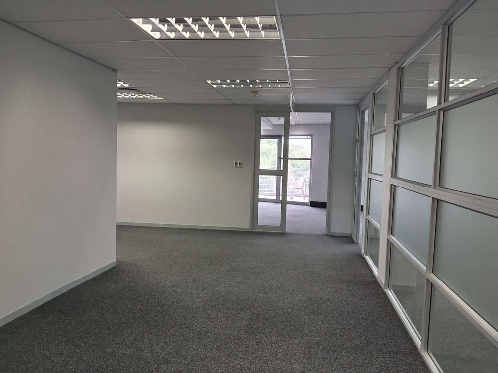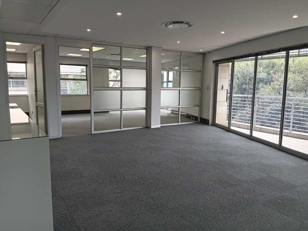 345.49 sqm office space to let, Woodmead, Sandton. Situated on the first floor of Building 29 within the prestigious Woodlands Office Park, this unit features a well-designed layout with multiple partitioned offices, a modern kitchen, and a charming balcony offering panoramic views of the Sandton Skyline and the nearby game park.