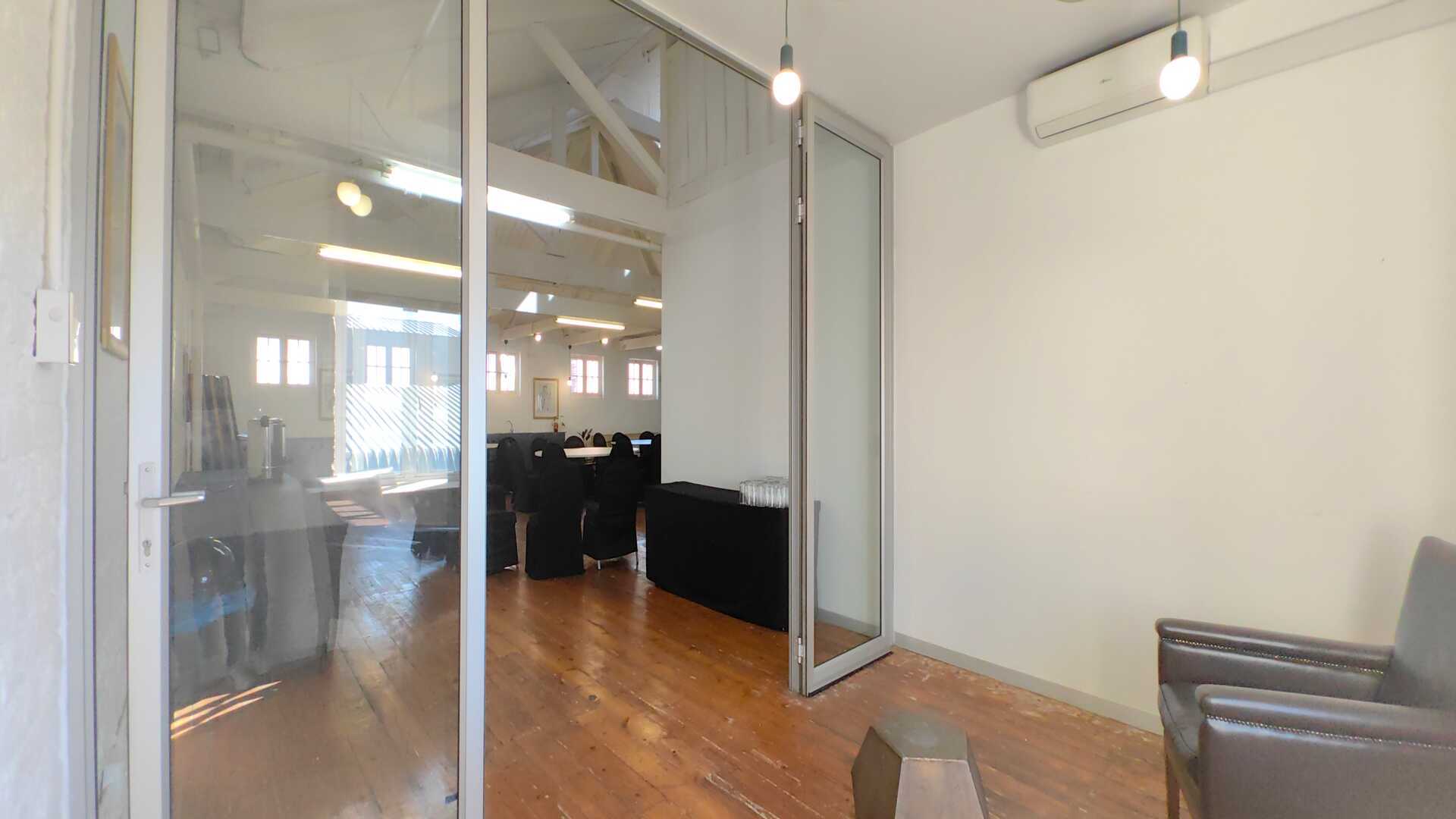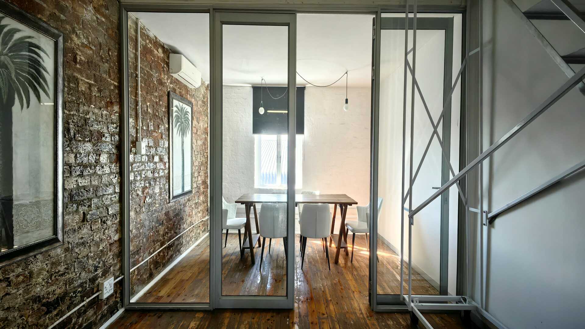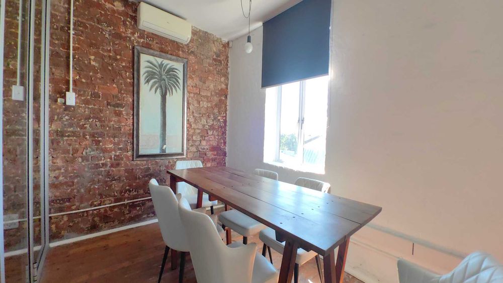 The unit comprises approximately 190m2 of main floor space, complemented by a 6m2 mezzanine level. Previously occupied by a co-working operator, the layout is both functional and versatile, featuring three private glass-partitioned offices alongside a spacious open-plan work area.